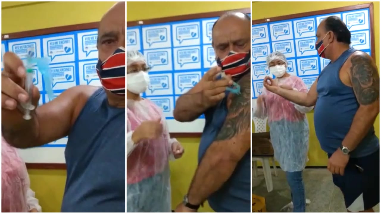 Em um vídeo, o homem aparece conversando com profissionais da saúde, já posicionado para receber o imunizante. A auxiliar de enfermagem, ergue o braço e mostra ao homem a seringa preparada. É quando ele toma o imunizante das mãos dela, aponta para a câmera do colega que estava filmando e, logo em seguida, de forma brusca, aplica a vacinação no próprio braço.