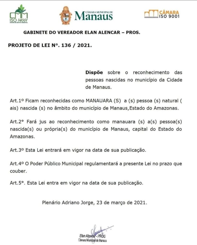 MANAUS – AM | O vereador Elan Alencar (Pros) apresentou um Projeto de Lei (PL) que visa tornar oficial o termo ‘manauara’ para quem nasce na capital do Amazonas. Segundo o parlamentar, a ideia surgiu após uma discussão de internautas nas redes sociais.