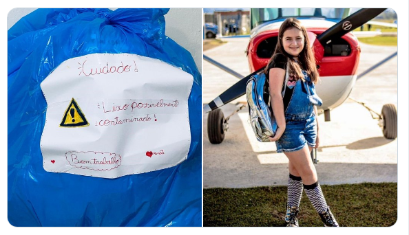 Com suspeita de Covid-19, a menina contou com a ajuda da mãe, a enfermeira Jaqueline Gaspar, para confeccionar o bilhete e deixar um recadinho para os garis da cidade em que mora, em São José (SC), para alertá-los sobre o risco de contaminação ao recolher o lixo.