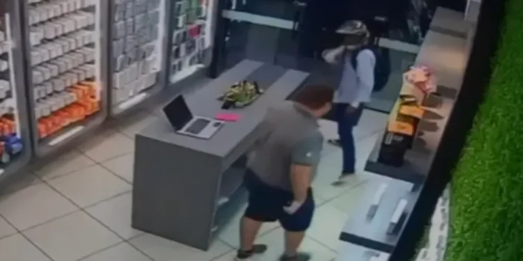 O incidente foi capturado pelas câmeras de segurança do estabelecimento, mostrando a ação dos assaltantes, que estavam em uma motocicleta preta. O condutor usava camisa cinza de manga longa e capacete branco, enquanto o assaltante que efetuou os disparos estava vestido com camisa branca, mochila e capacete preto.