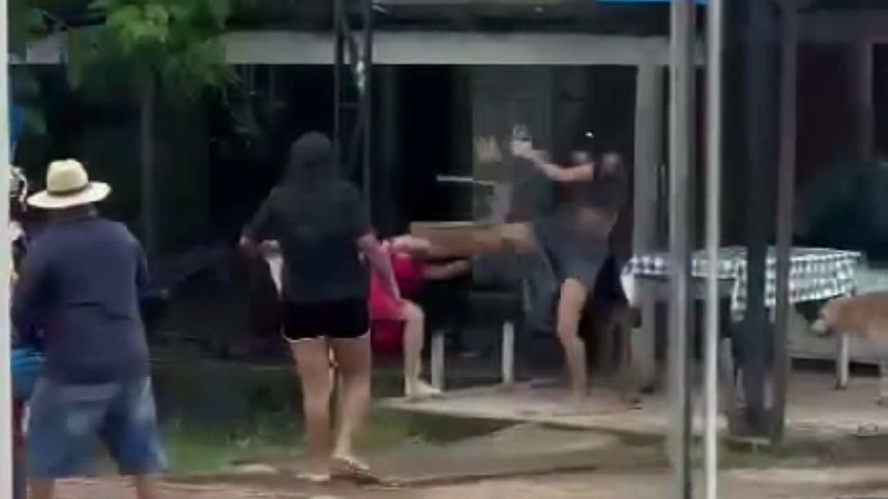 Imagens que circulam nas redes sociais mostram o momento em que as duas trocam insultos e partem para a agressão física. Durante a confusão, cadeiras são jogadas, enquanto curiosos acompanham a cena.