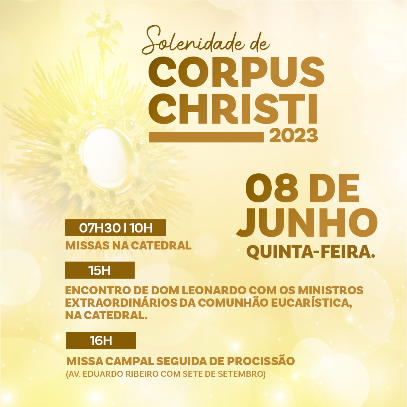 MANAUS (AM) – No dia 8 de junho, a Igreja Católica celebra a Solenidade de Corpus Christi. Com o tema “Na Eucaristia, Ele vive e caminha conosco. A Santa Missa em Manaus acontece às 16h na Avenida Eduardo Ribeiro, seguida de procissão e Adoração Eucarística.