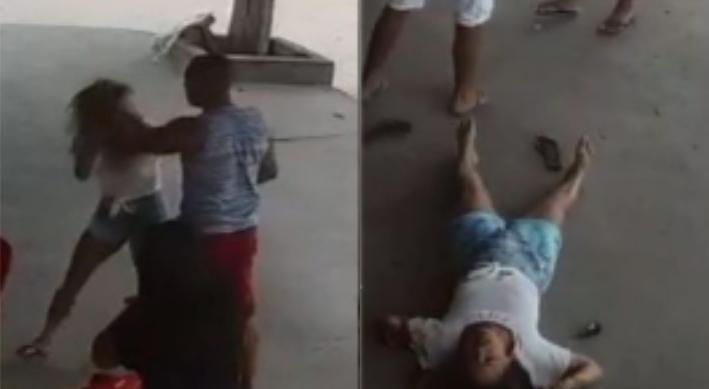 No vídeo, é possível ver a mulher em um bar com um casal, quando de repente, o agressor chega e a puxa pelos cabelos. O homem tenta intervir, mas de nada adianta, já que com um golpe certeiro no rosto, a vítima cai ao chão desacordada.