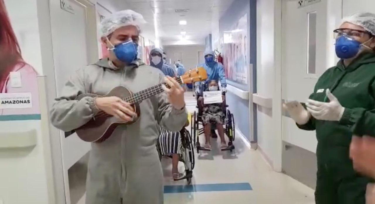 O “corredor da vitória”, momento de comemoração para os pacientes que venceram a Covid-19 e para os profissionais de saúde, ganhou ainda um novo elemento: música, interpretada pelo médico Henrique Rego. Após avaliar que o som não incomodaria os pacientes no andar, a equipe incorporou, além das palmas, canto e o som do ukulele para celebrar a recuperação dos pacientes.