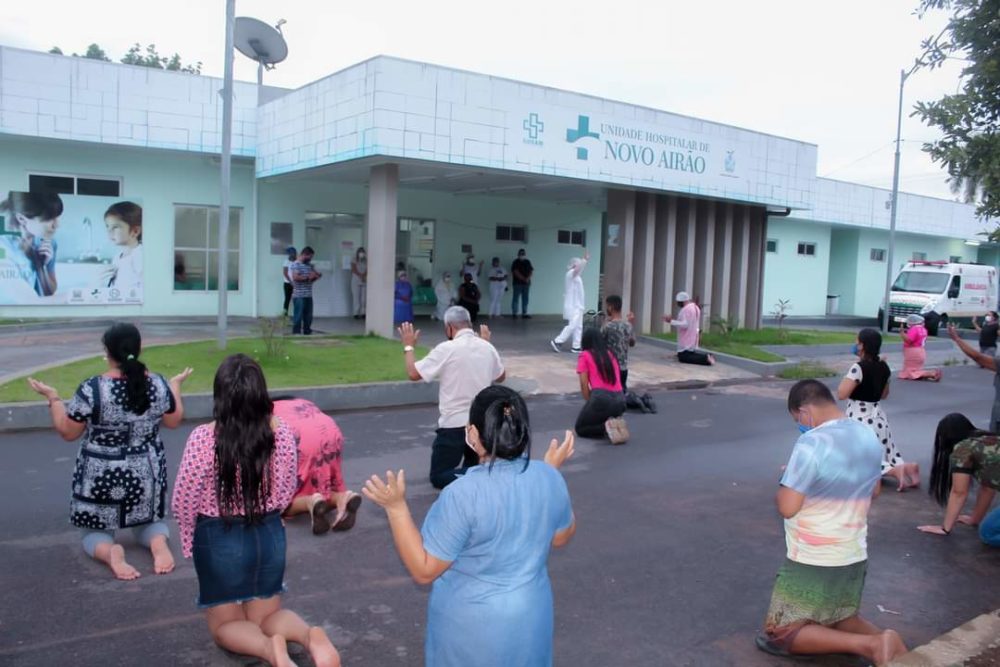 NOVO AIRÃO-AM| Imagens que circulam nas redes sociais mostram moradores e profissionais da saúde orando em frente ao hospital Geral de Novo Airão (distante 115 km de Manaus), pelos pacientes e profissionais que lutam diariamente contra a covid-19 no município.