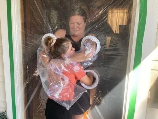 Os avós se organizaram em uma fila, com os braços da garota dentro de duas mangas de plásticos, e os braços dos avós colocados nas mangas restantes, o momento emocionante aconteceu. As imagens do encontro foram publicados pelos parentes da menina nas redes sociais.