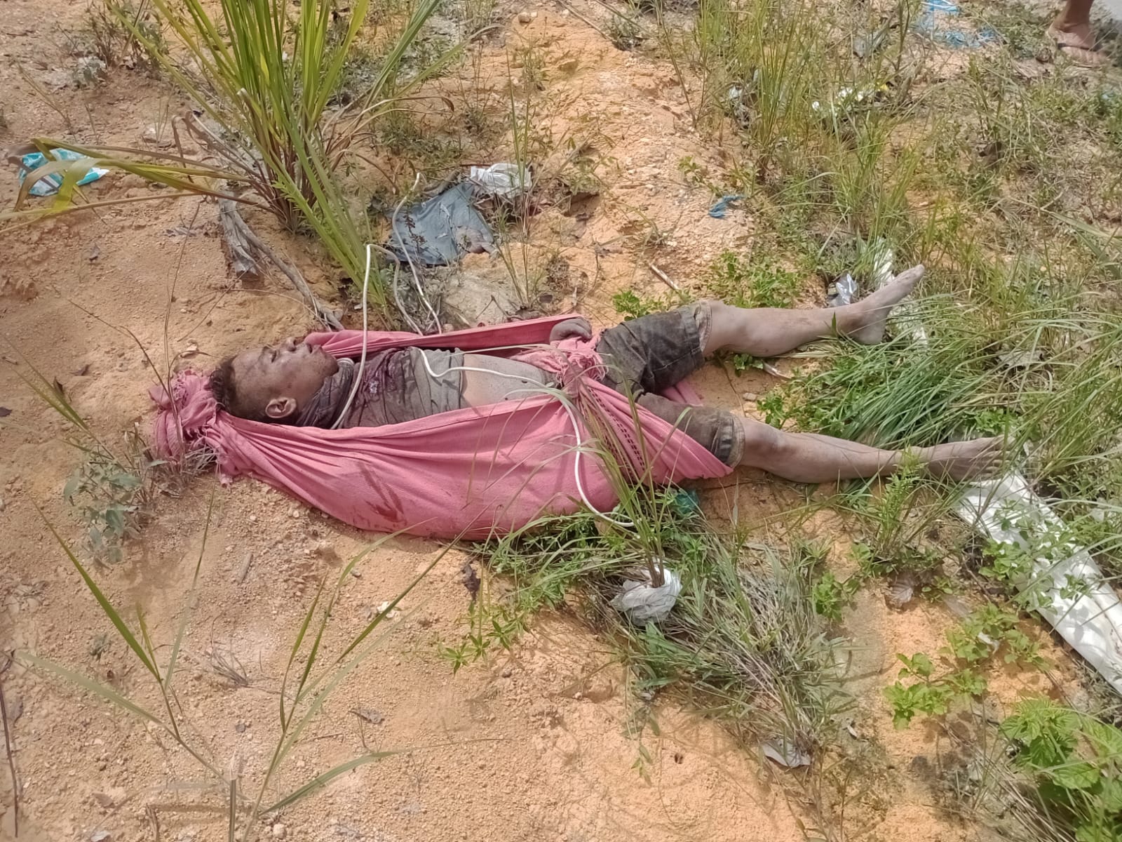A vítima não foi identificada; ela trajava blusa e bermuda escura, estava enrolada em um pano vermelho, amarrada com fio elétrico e com sinais de tortura.