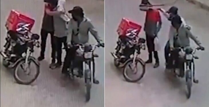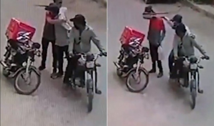 Uma câmera de segurança flagrou o momento em que dois criminosos chegam de moto para assaltar outro motociclista, que segundo informações do jornal paquistanês The Express Tribune, seria motoboy.