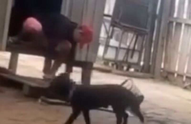 Nas imagens, é possível ver que o animal recebe diversos deferimentos bem na porta de entrada de uma casa.