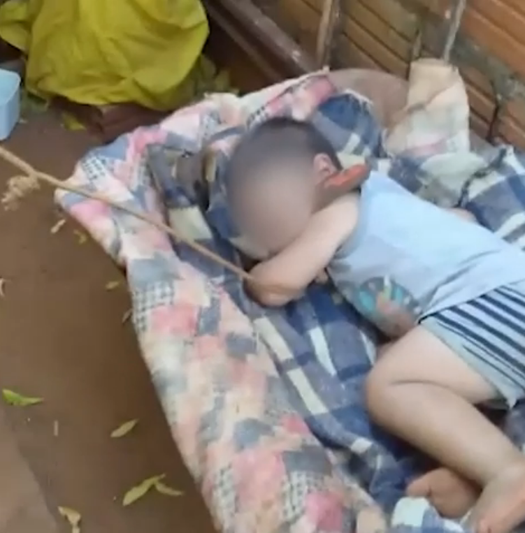 “Que eu faço com menino arteiro? Ponho na corda. Tá preso. É arteiro”, disse o homem, ao mostrar a criança deitada ao chão em condições precárias. Segundo à polícia, o indivíduo é suspeito de cometer violência doméstica contra a mãe da criança.