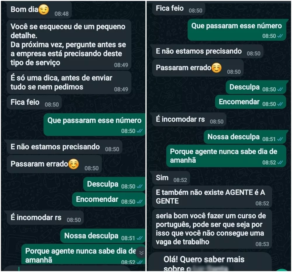 SÃO PAULO | Uma cuidadora de idosos de 43 anos foi hostilizada pela atendente de um asilo de Sorocaba (SP) na última quinta-feira (14). Por causa de alguns erros nas mensagens, a funcionária sugeriu que Cristiane Barros fizesse um curso de português e disse que era “por isso que ela não arrumava trabalho”.