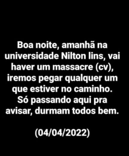 “Boa noite, amanhã na Universidade Nilton Lins vai haver um massacre (CV), iremos pegar qualquer um que estiver no caminho. Só passando aqui para avisar. Durmam todos bem”, diz a mensagem. Veja a mensagem no final da matéria.