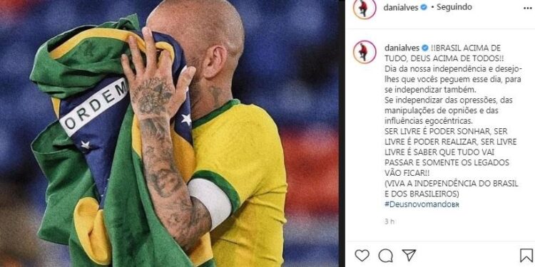 BRASIL | Jogador do São Paulo, o lateral-direito Daniel Alves utilizou as suas redes sociais para demonstrar apoio aos atos de 7 de setembro, impulsionados pelo presidente Jair Bolsonaro (sem partido). Apesar de não apoiar nominalmente, o atleta utilizou o slogan de campanha do governante em uma publicação nas redes sociais.