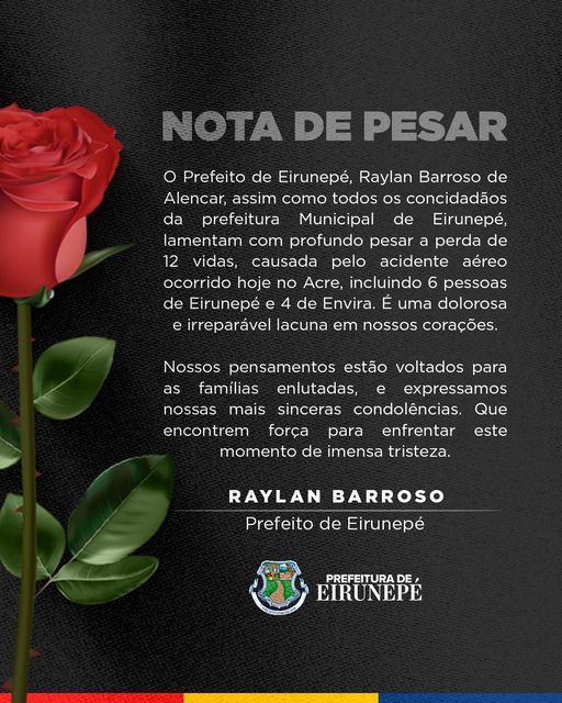 RIO BRANCO (AC) – O prefeito de Eirunepé, Raylan Barroso de Alencar, informou que das 12 pessoas vítimas da queda de um avião de pequeno porte em Rio Branco, no Acre, 10 eram amazonenses, sendo seis de Eirunepé e quatro de Envira. O acidente ocorreu na manhã deste domingo (29) e a aeronave tinha como destino Envira, no interior do Amazonas.