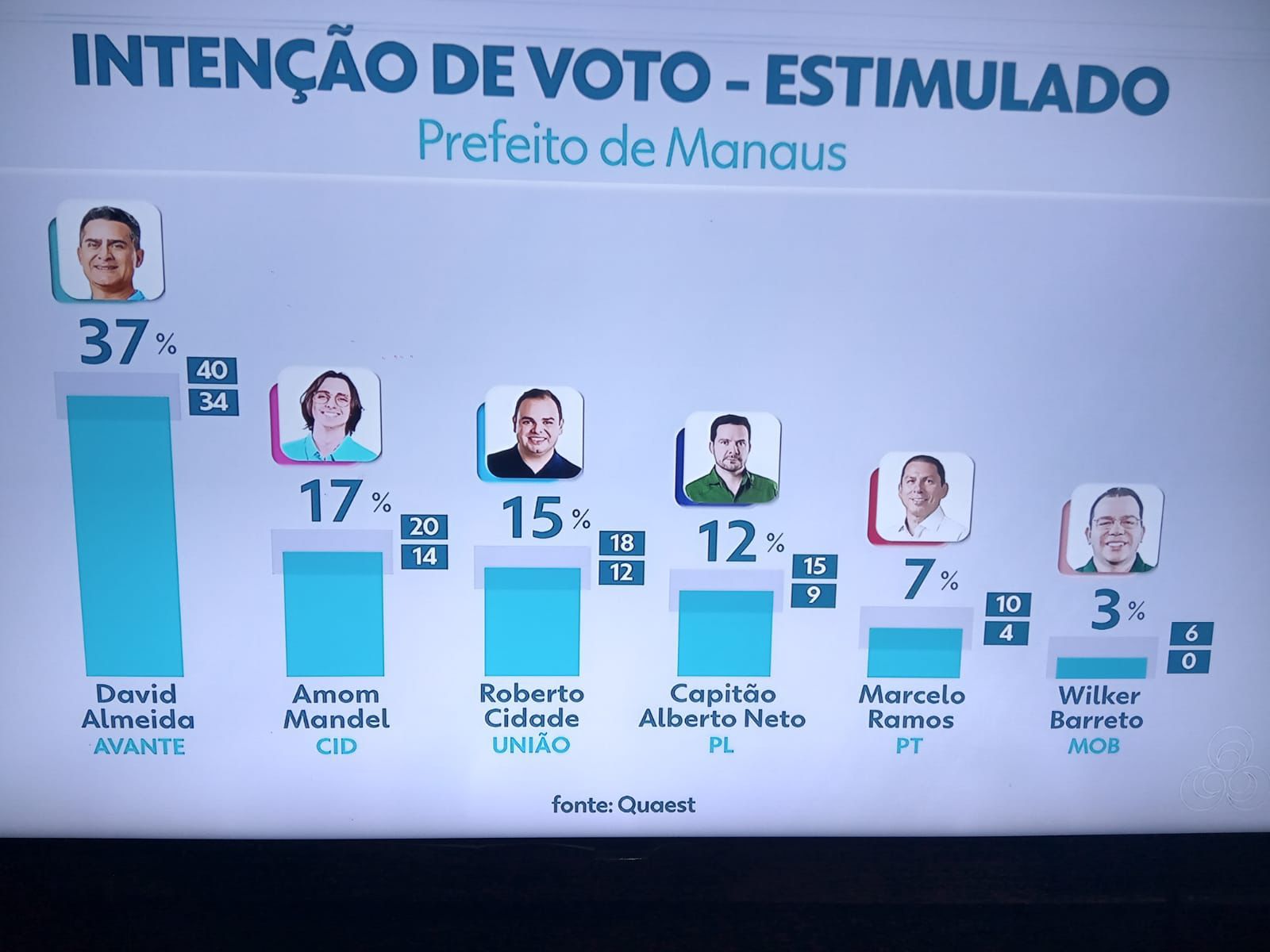 Neste cenário, David Almeida também é líder e aparece com 16% das intenções, o dobro do segundo colocado, Roberto Cidade, 8%. Amom Mandel aparece com 6%, Alberto Neto, com 4%, Marcelo Ramos, 1%, e Wilker Barreto, 0%.