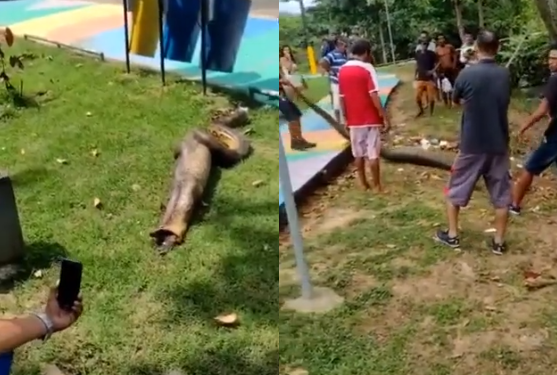 A sucuri aparece “cheia” e é puxada pelo rabo por um morador. Ela estava mais para a área de mata que fica perto da praça, quase chegando num igarapé.