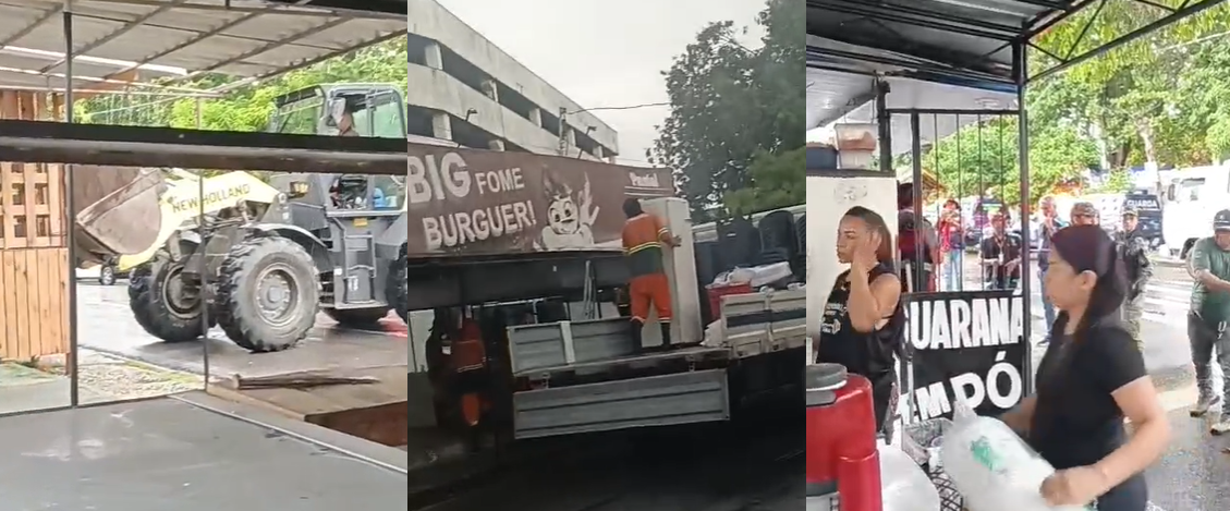 Com apoio de caminhões, guardas municipais e servidores da Secretaria Municipal de Infraestrutura (Seminf), as equipes utilizaram retroescavadeiras para demolir boxes e estruturas comerciais. Imagens que circulam nas redes sociais registram a rapidez e o caráter destrutivo da intervenção, enquanto comerciantes eram impedidos de resgatar seus pertences. “Chegaram tratando a gente como criminoso”, diz um deles.