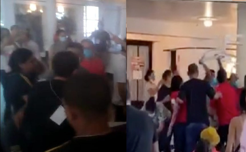 Nos vídeos é possível ouvir troca de xingamentos, socos e até uma cadeira sendo arremessada. Uma pessoa grita que “tudo está sendo filmado”. Uma mulher diz: “Tu tá me segurando, é? Tu tá doido, é?”.