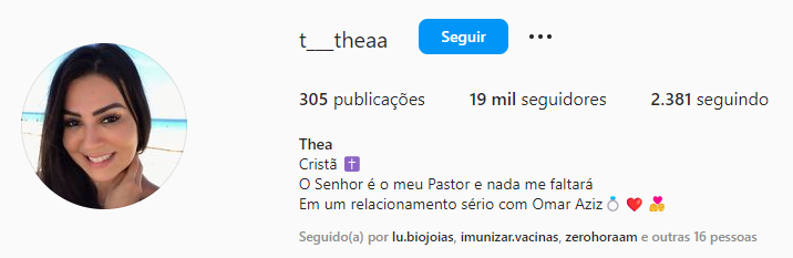 MANAUS (AM) – Mais uma suposta amante vazou nas redes sociais. Desta vez seria a do senador Omar Aziz (PSD), casado com a ex-deputada estadual Nejmi Aziz, mas que estaria supostamente com a dentista identificada apenas como “Thea”. Ela postou na bio do Instagram que tem um “relacionamento sério” com o parlamentar.