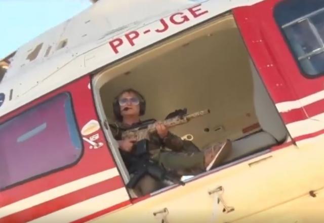 Nas imagens, a deputada que tem 72 anos, está a bordo de um helicóptero e porta um fuzil. Ela diz: “Te cuida, Lázaro. Se o Caiado não deu conta de te pegar, eu estou indo aí te pegar.”
