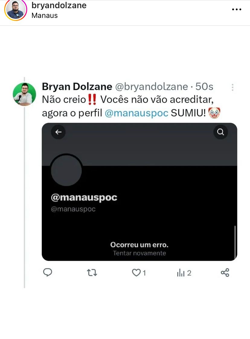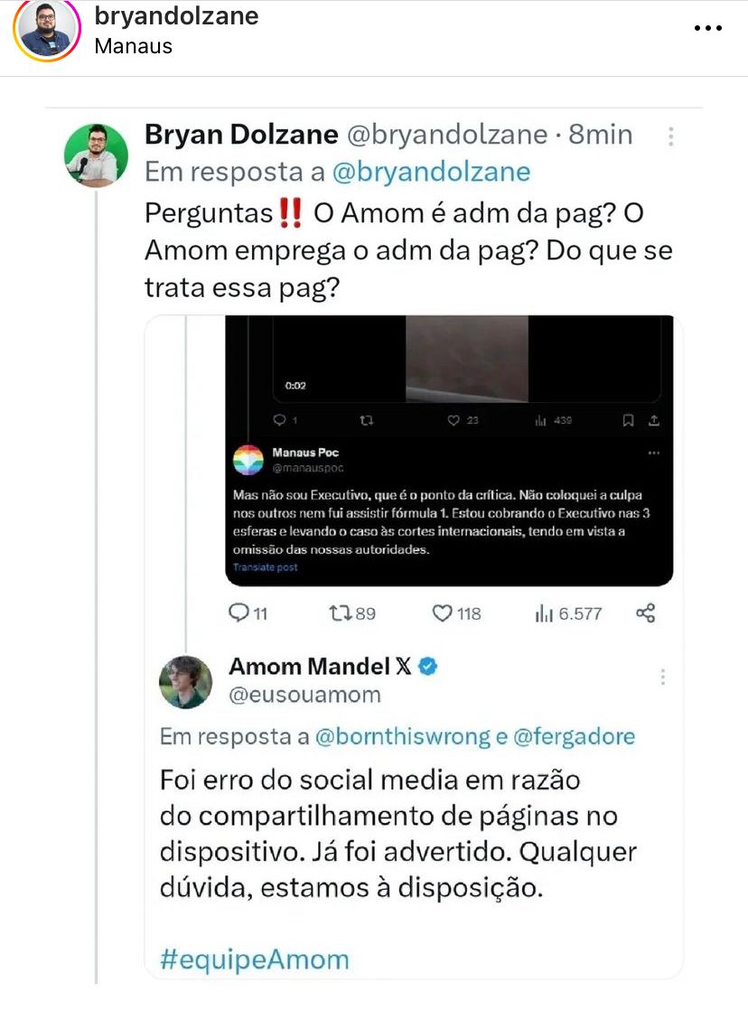 Amom, na hora de responder, falou na primeira pessoa, mas acabou se esquecendo que estava na conta da Manaus Poc. Após o “erro”, a postagem foi excluída e o perfil também, mas o “print” é eterno.