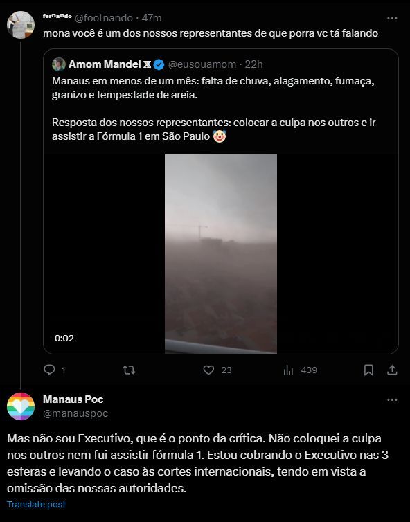 Na publicação, um usuário da rede social identificado como Fernando (@foolnando) critica a postagem de Amom que falava que em menos de um mês, em Manaus, a cidade já tinha presenciado granizo, tempestade de areia, alagamento, além da fumaceira e a falta de chuvas. O deputado criticava os governantes e deu uma indireta especificamente para David Almeida (Avante).