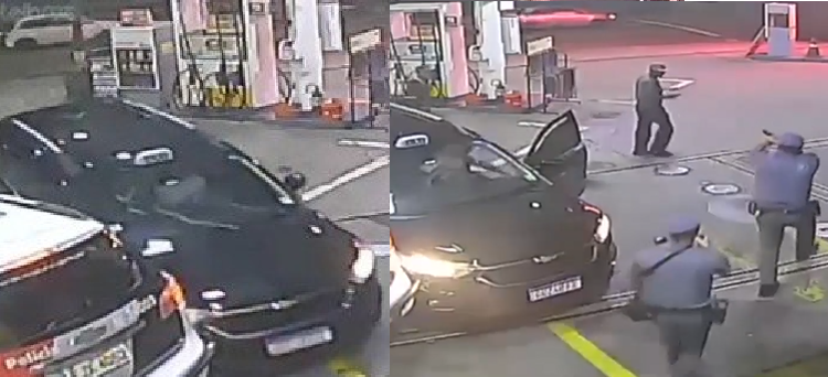 Imagens registraram o momento da batida, que faz dois homens saírem do carro correndo. Em seguida, os PMs correm apontando as armas e os prendem. O caso ocorreu dentro de um posto da rede Shell, em frente à loja de conveniência.