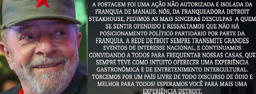 Manaus – No início da tarde desta quarta-feira (24), a gerente responsável pelo marketing da Detroit Steakhouse Brasil, Renata Carvalho, informou ter tomado conhecimento da repercussão da promoção realizada pela franqueada em Manaus. Ela informou que a direção da empresa não autorizou nenhum tipo de promoção de cunho político e já solicitou ao franqueado em Manaus que retirasse do ar a publicação.