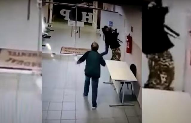 Em seguida, ele responde apontando o dedo para o rosto dela. Ao se virar, ela é atacada com um mata-leão pelas costas. Depois do golpe, com a professora já no chão e a porta da escola caiu em cima dela. Na sequência, o estudante continua com as agressões, até que é contido por outras pessoas.