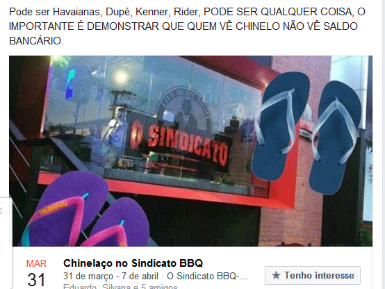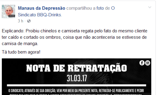 Manaus –‘Com que roupa eu vou, com que roupa eu vou, pro samba que você me convidou…’, diz o samba de Noel Rosa já cantado também por Caetano Veloso e Zeca Pagodinho.No bar conhecido como O Sindicato BBQ, localizado na rua Maceió, um médico e um funcionário público foram impedidos de entrar no estabelecimento por estarem de chinelo. O estabelecimento mudou a sua política de vestuário, mas não havia até o dia do episódio nenhuma placa com a orientação.