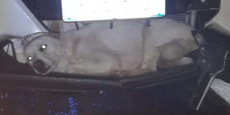 A equipe da ambulância veterinária retirou o animal do veículo. Ele estava apenas com ferimentos leves, em especial em uma das patas. Já no hospital, exames mostraram que não houve danos na parte cerebral ou na coluna do cachorro.