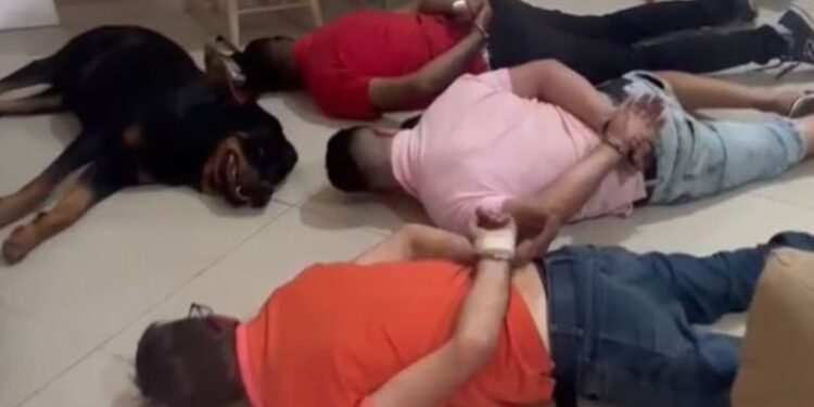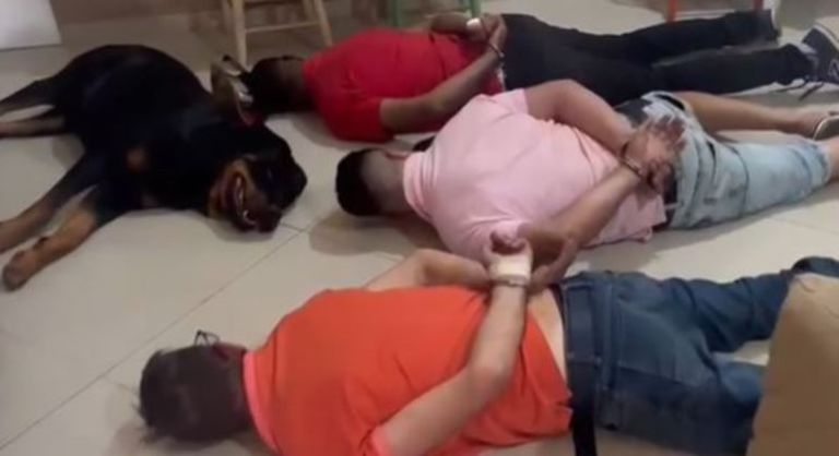 Em foto divulgada pela polícia, os três suspeitos aparecem deitados no chão enquanto a equipe revista o imóvel. O cachorro também se deita ao lados dos homens, ‘rendido’.