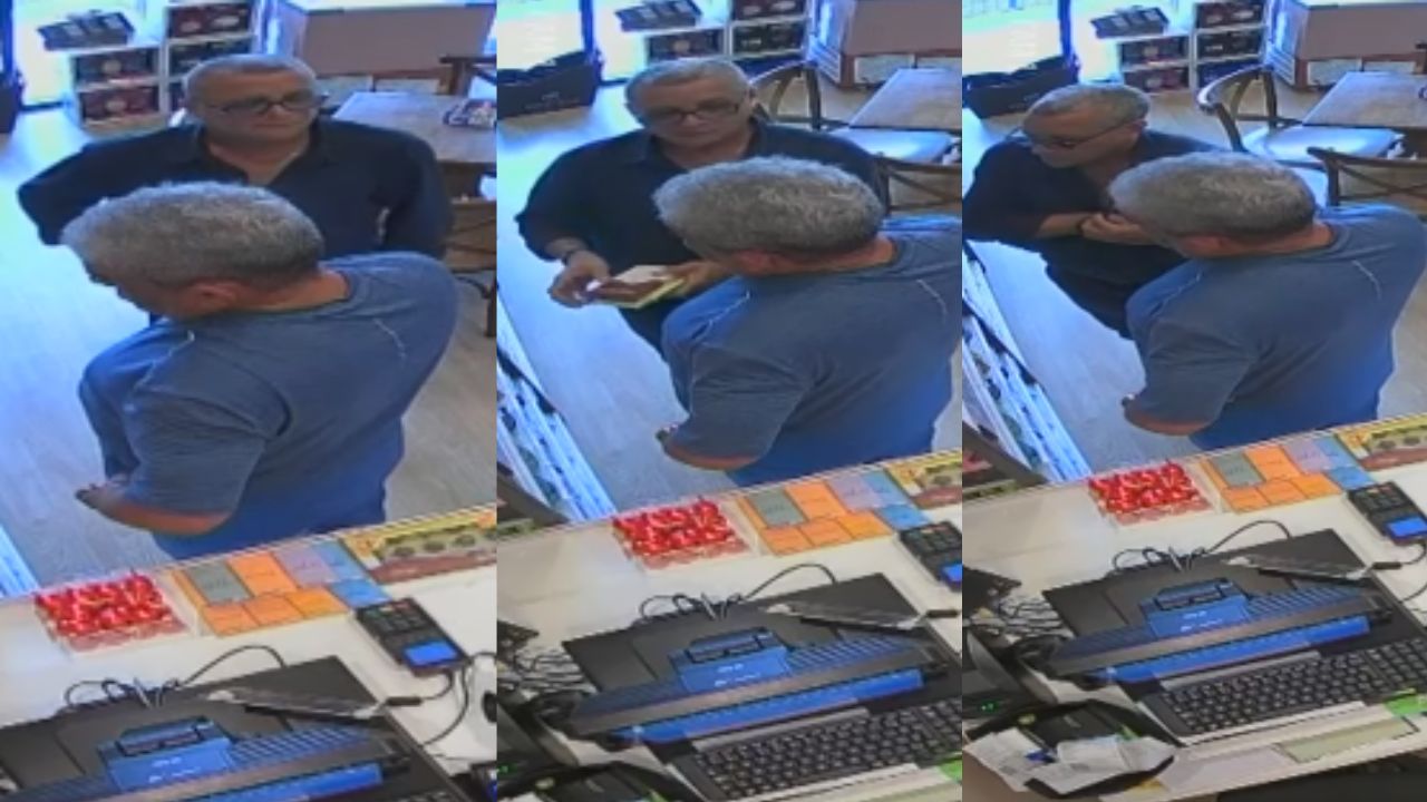 A dupla aparece no vídeo conversando, fingindo ser clientes interessados na compra, quando, ao verem que a atendente estava distraída no balcão, um deles coloca as barras na camisa.