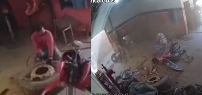 BAHIA | Câmeras de segurança de uma borracharia registraram o momento em que o dono identificado como Nael Santos da Mata, 29, foi atingido por uma explosão enquanto calibrava um pneu no estabelecimento.