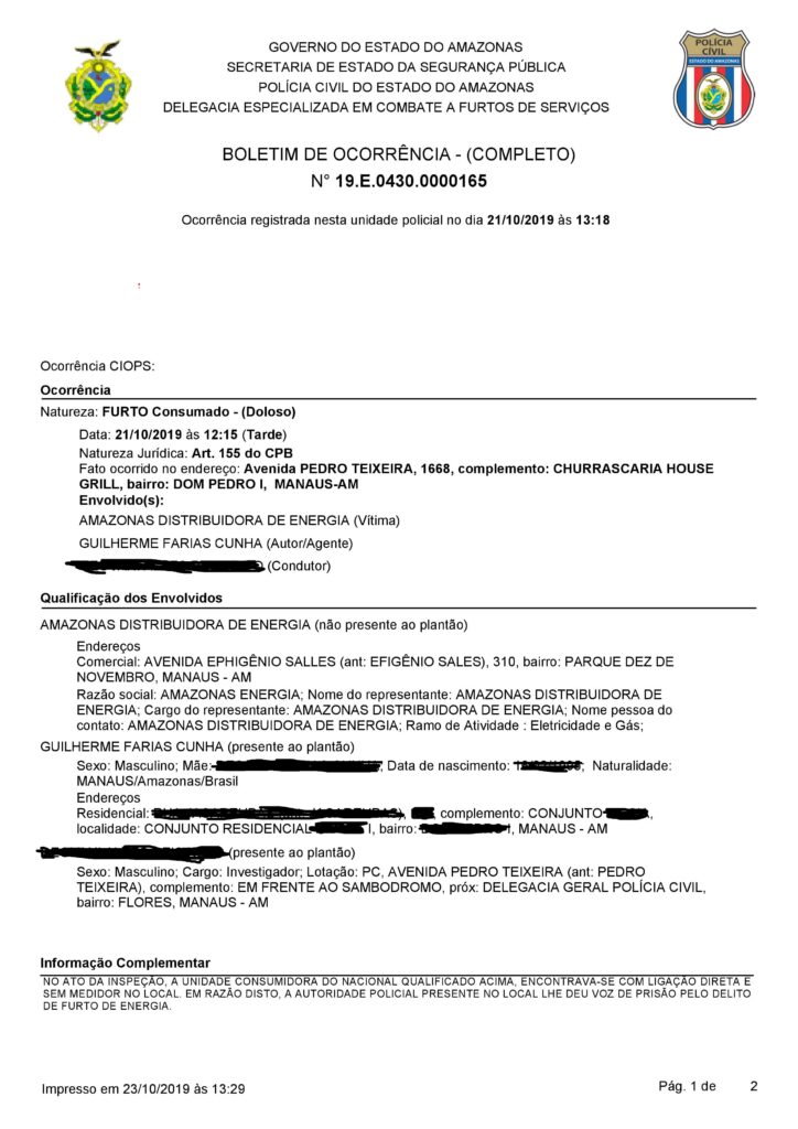 Manaus – O empresário Guilherme Farias Cunha foi preso em flagrante na tarde da última segunda-feira (21) por suspeita de furtar energia elétrica no bairro Dom Pedro, zona Oeste da capital amazonense.