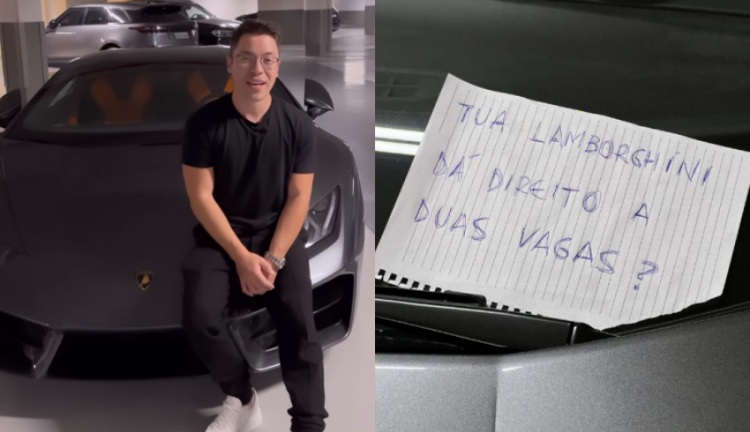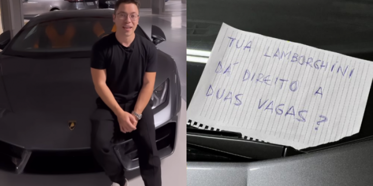 “Tua Lamborghini dá direito a duas vagas?” foi escrita à caneta em uma folha de caderno e deixada no para-brisas do veículo.