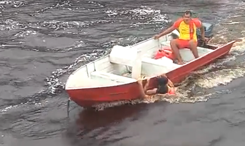 Um dos bombeiros pulou rapidamente na correria e consegue erguer a vítima. Um outro bombeiro ajudou usando a lancha e fazendo o resgate do colega e do banhista.