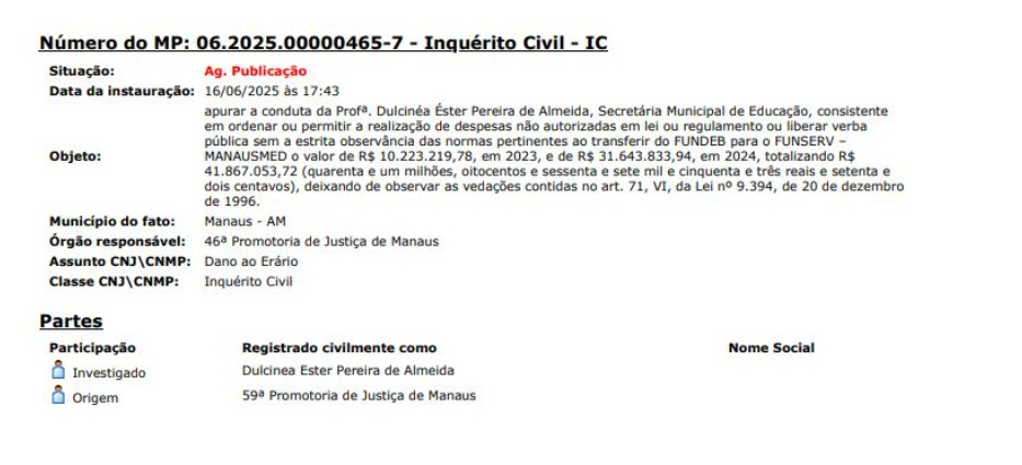 MANAUS – A irmã do prefeito de Manaus, Dulce Almeida, está na mira dos órgãos de controle, depois de ser denunciada por suposto desvio de verba do Fundeb. Na gestão David Almeida, ela teria utilizado R$ 41,8 milhões do Fundo de Manutenção e Desenvolvimento da Educação Básica (Fundeb) em atividades desconhecidas, não informadas e com desvio de finalidade.
