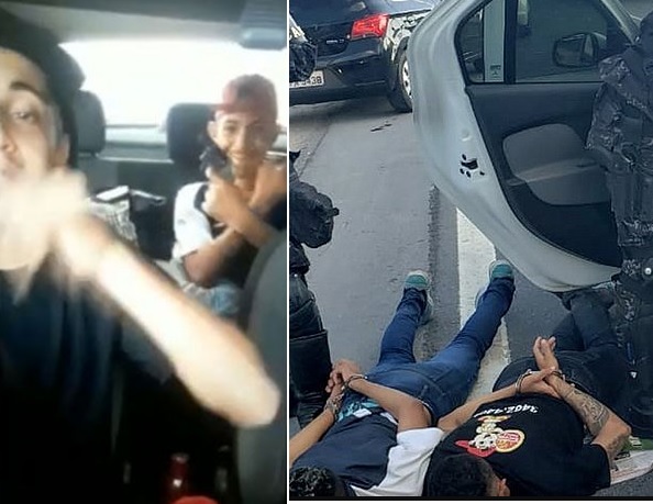 As imagens do vídeo da “live” circularam pelo WhatsApp. Os dois aparecem dançando dentro do carro roubado e um deles exibe a arma usada no crime. Depois, a Polícia Militar chega e prende a dupla. Os dois aparecem preocupados e depois colocando as mãos para o alto. “Polícia…”, diz um. “Calma”, recomenda o outro. Mas logo em seguida são ouvidos gritos e a abordagem acontece.