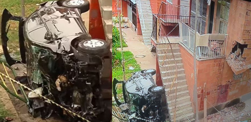 Após denúncias, a Polícia Militar foi acionada e conseguiu localizar o veículo. Os suspeitos, no entanto, fugiram e perderam o controle da direção, despencando da via e caindo em um apartamento que ficou com parte da estrutura comprometida com um buraco.