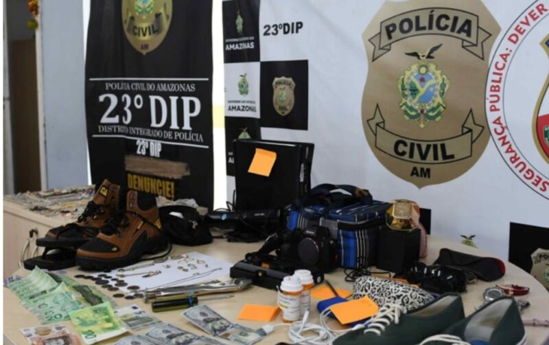 Com o criminoso, foram encontradas moedas estrangeiras, bijuterias, relógios de pulso, acessórios fotográficos e de vestuário, além de equipamentos eletrônicos, ferramenta e outros materiais.