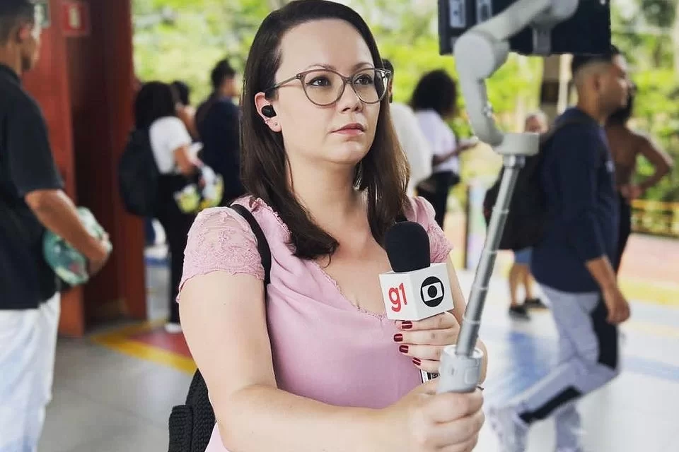 A jornalista estava na estação falando sobre a situação do metrô quando a transmissão foi interrompida bruscamente.