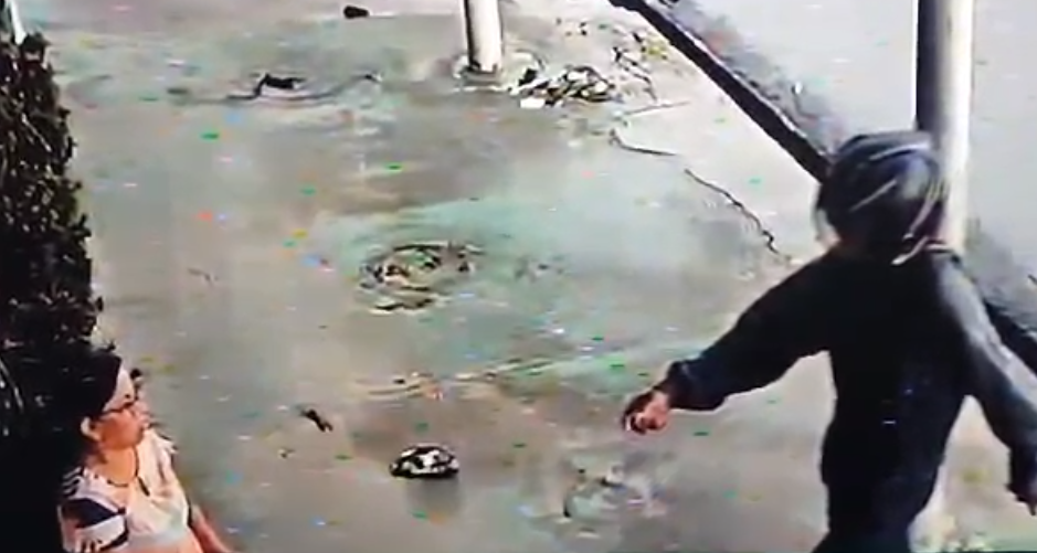 Logo depois o comparsa desce da moto e atravessa a rua para roubar o celular de uma mulher que estava no outro ponto.