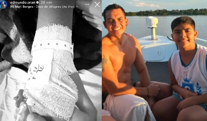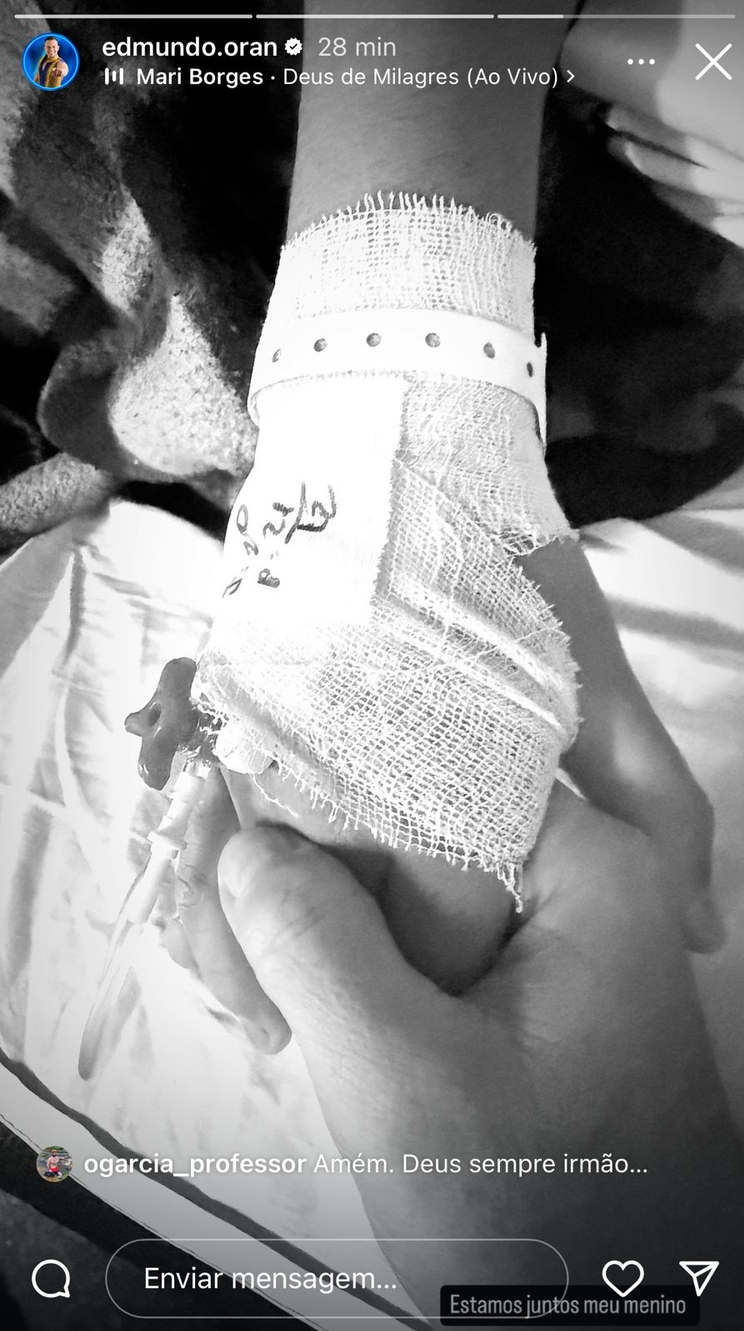 O garoto de 14 anos está desde o dia 1º de dezembro internado em hospital particular de Manaus. No Instagram, Edmundo publicou uma foto segurando a mão do filho que recebe medicação. “Estamos juntos meu menino”, escreveu ele, que também colocou uma música gospel de fundo na postagem, “Deus de Milagres”.
