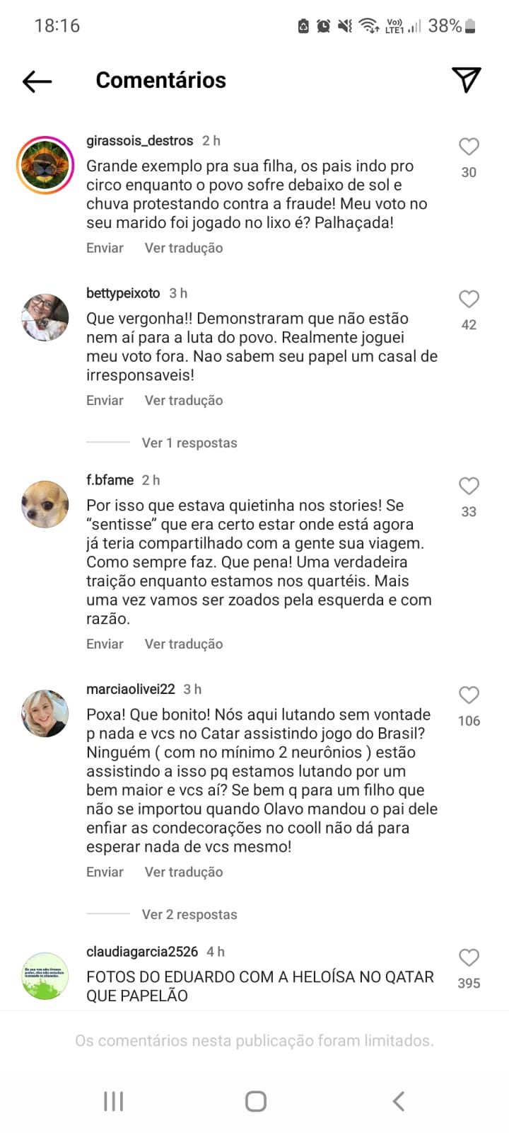 “Enquanto estamos na frente dos quartéis, pela liberdade e pelo Brasil, ele está curtindo a vida. Por isso eu não tenho político de estimação!“, escreveu outra no Twitter.