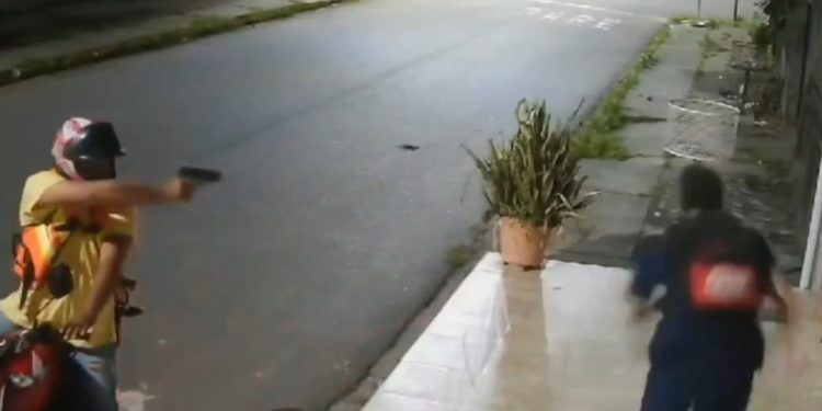 O jovem estava a pé quando foi abordado por criminosos que se aproximaram em duas motocicletas. A vítima caiu na calçada ao tentar se proteger, mas conseguiu se levantar e fugir.