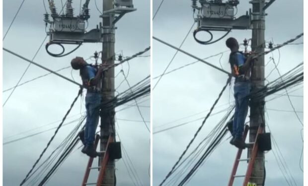 Segundo testemunhas, o homem ainda ficou desacordado após levar o choque, mas voltou a si e conseguiu se desamarrar dos fios para descer a escada.