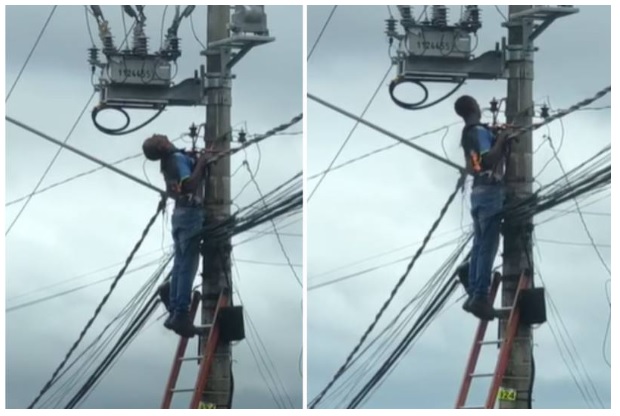 No vídeo, ele aparece tentando se desvencilhar dos fios e equipamentos, até que consegue descer da escada, com parte das costas em chamas. Ele foi socorrido por populares.
