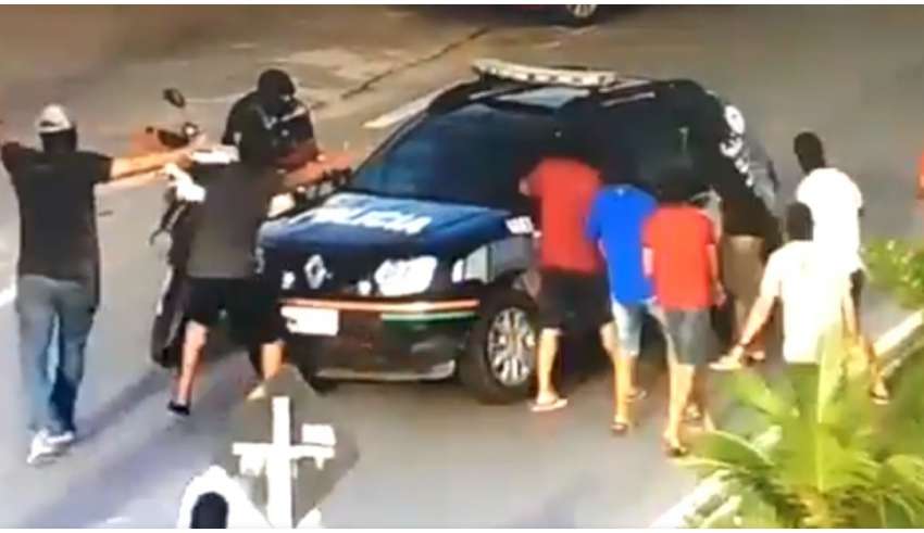 Veja o momento em que homens encapuzados cercam uma viatura da Polícia Civil:
