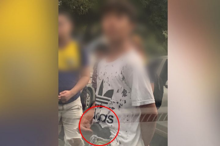 Com uma pistola na cintura, o estudante fica rindo e mostra para os amigos o objeto escondido por baixo da camisa. A cena foi registrada por uma testemunha, que estava dentro de um carro, bem na frente da escola.